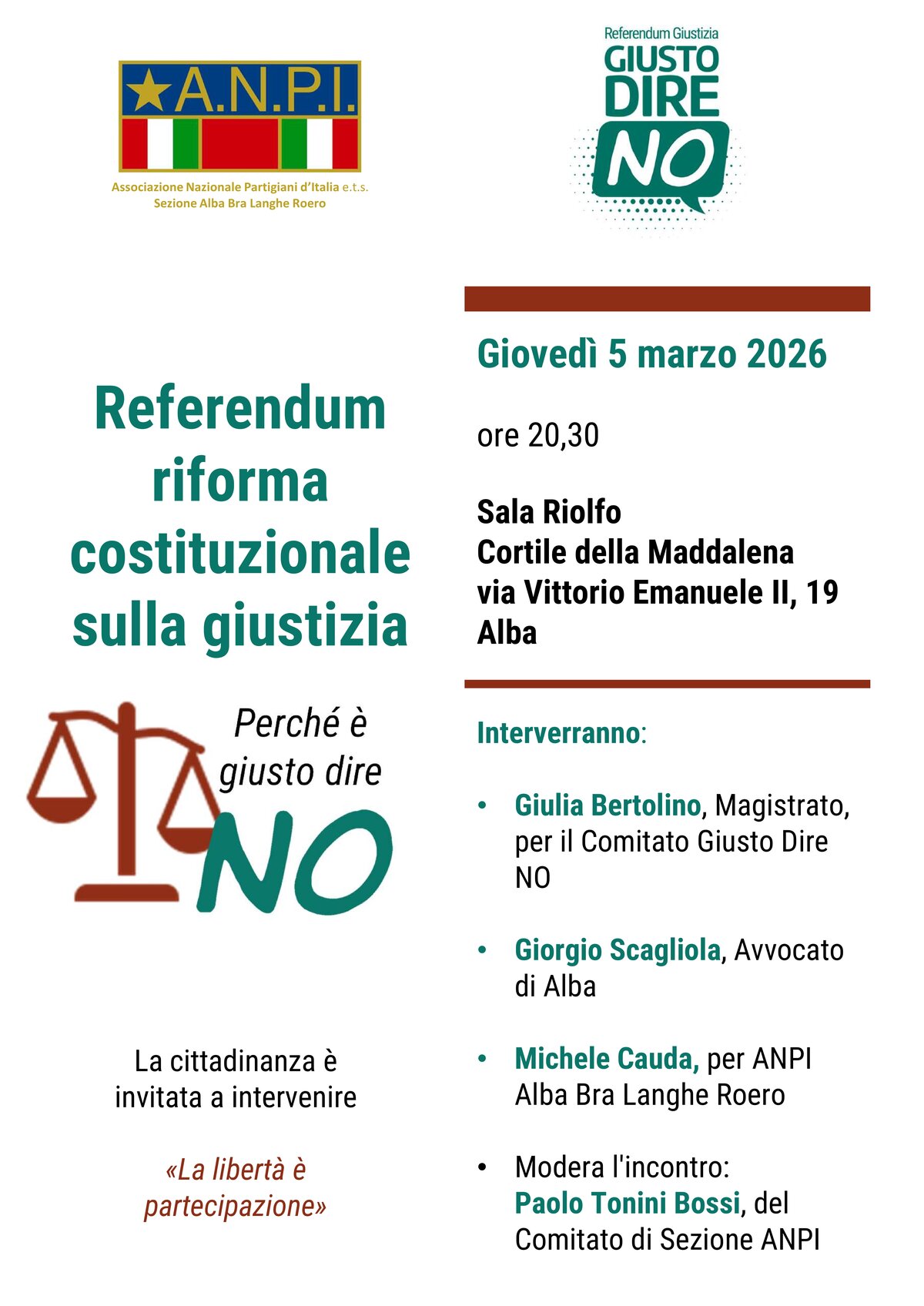 Giovedì 5 marzo 2026, alle 20:30 ad Alba, in Sala Riolfo, Cortile della Maddalena (via Vittorio Emanuele II, 19) saranno presenti Giulia Bertolino, magistrato per il “Giusto Dire NO”, Giorgio Scagliola, avvocato di Alba, Michele Cauda per l’ANPI Alba Bra Langhe Roero. Modera l’incontro Paolo Tonino Bossi del Comitato di Sezione ANPI.