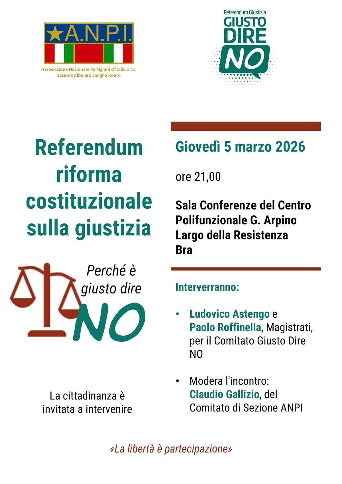 Sempre giovedì 5 marzo 2026, alle 21:00 a Bra, in sala conferenze del Centro Polifunzionale Arpino (largo della Resistenza) saranno presenti Ludovico Astengo e Paolo Roffinella, magistrati, per il Comitato “Giusto Dire NO”. Modera l’incontro Claudio Gallizio del Comitato di Sezione ANPI.