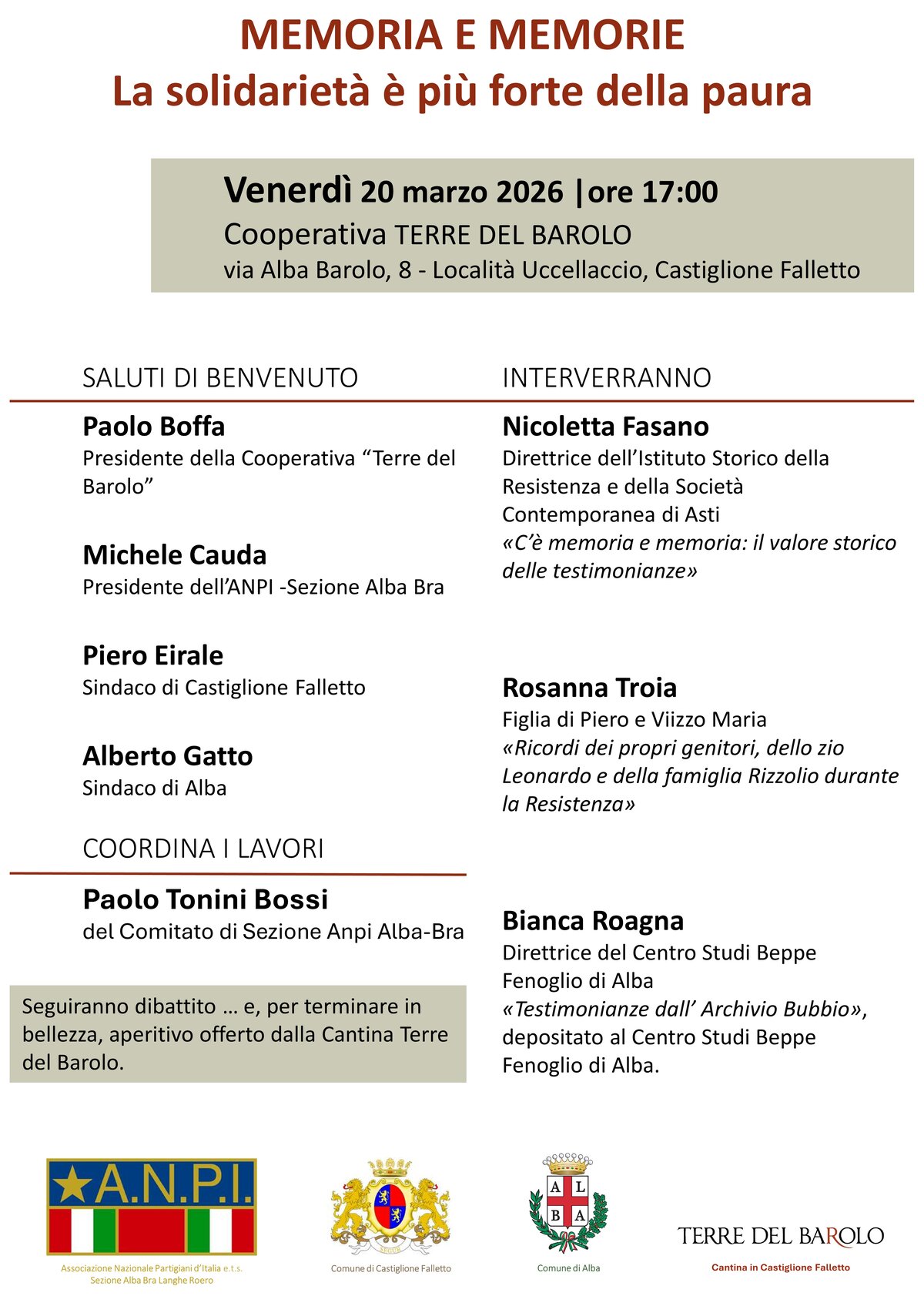 Come tutti gli anni, la Sezione ANPI Alba-Bra in collaborazione con la Cooperativa Terre del Barolo organizza presso la sala conferenze della Cooperativa in via Alba Barolo 8 - Località Uccellaccio, Castiglione Falletto, alle ore 17:00 il convegno "MEMORIA E MEMORIE - La solidarietà è più forte della paura".