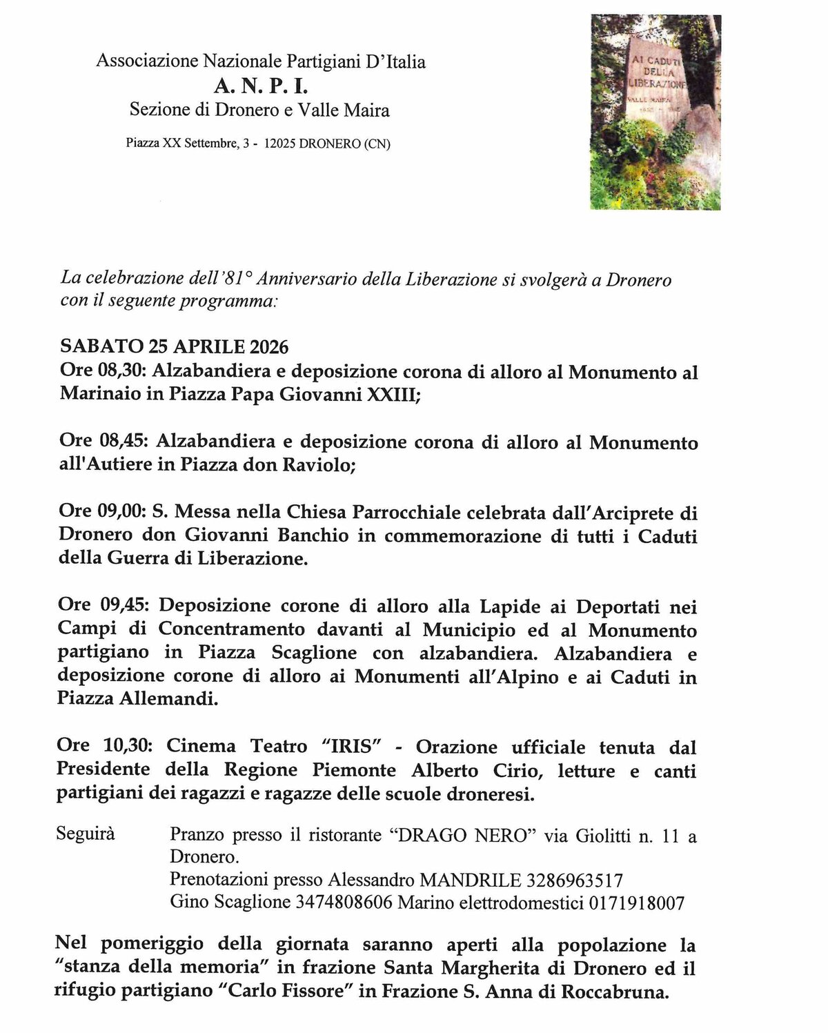 Programma celebrazione per 25 Aprile ANPI Dronero