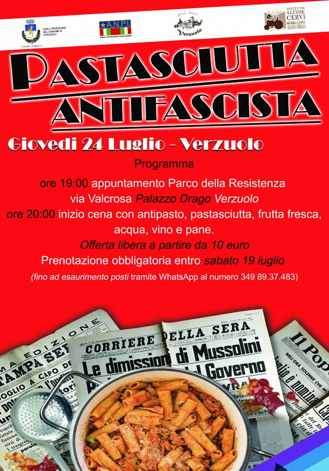 Il giorno 24 luglio 2025 a Verzuolo come in molte parti d'Italia, appuntamento Parco Resistenza-Palazzo Drago per pastasciutta antifascista.