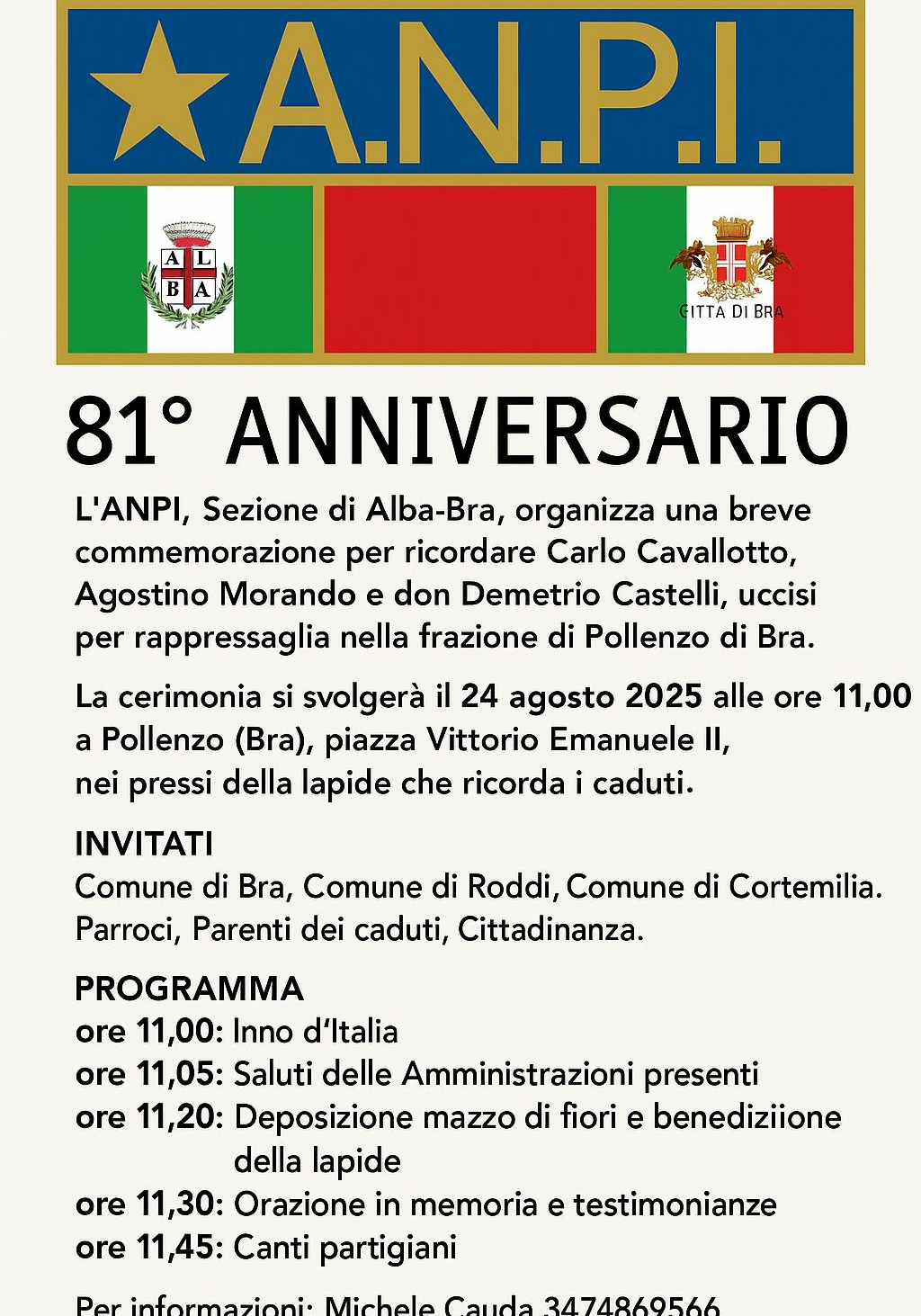 Commemorazione a Pollenzo il 24 agosto 2025 in memoria dei tre caduti: Carlo Cavallotto, Agostino Morando e don Demetrio Castelli.