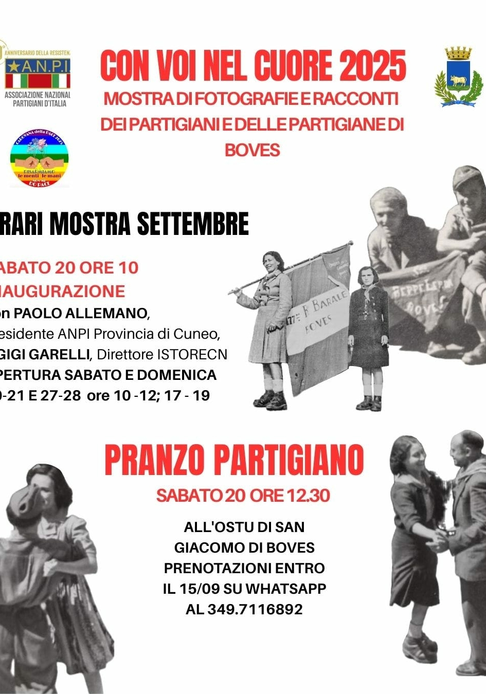 Vi aspettiamo tutti all'inaugurazione della mostra "CON VOI NEL CUORE, Fotografie e racconti dei partigiani e delle partigiane di Boves" sabato 20 settembre alle ore 10 nella ex Chiesa di Santa Croce